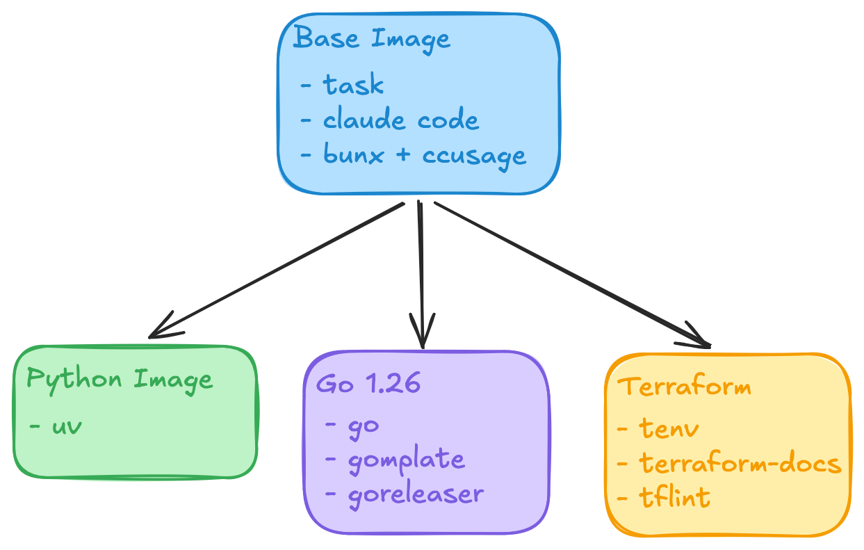 baseimage is a great place to standardize generic tools like task runners (taskfiles being a personal favorite), utilities (prek is awesome since it's lightweight and fast), and AI coding agents likeclaudewith their groupies like ccusage. - Version your tools but update regularly with Renovate - This guards against supply chain attacks while maintaining a forward-looking toolchain for your developers. I highly recommend following Renovate best practices like grouping updates and having reasonably long cooldown windows.